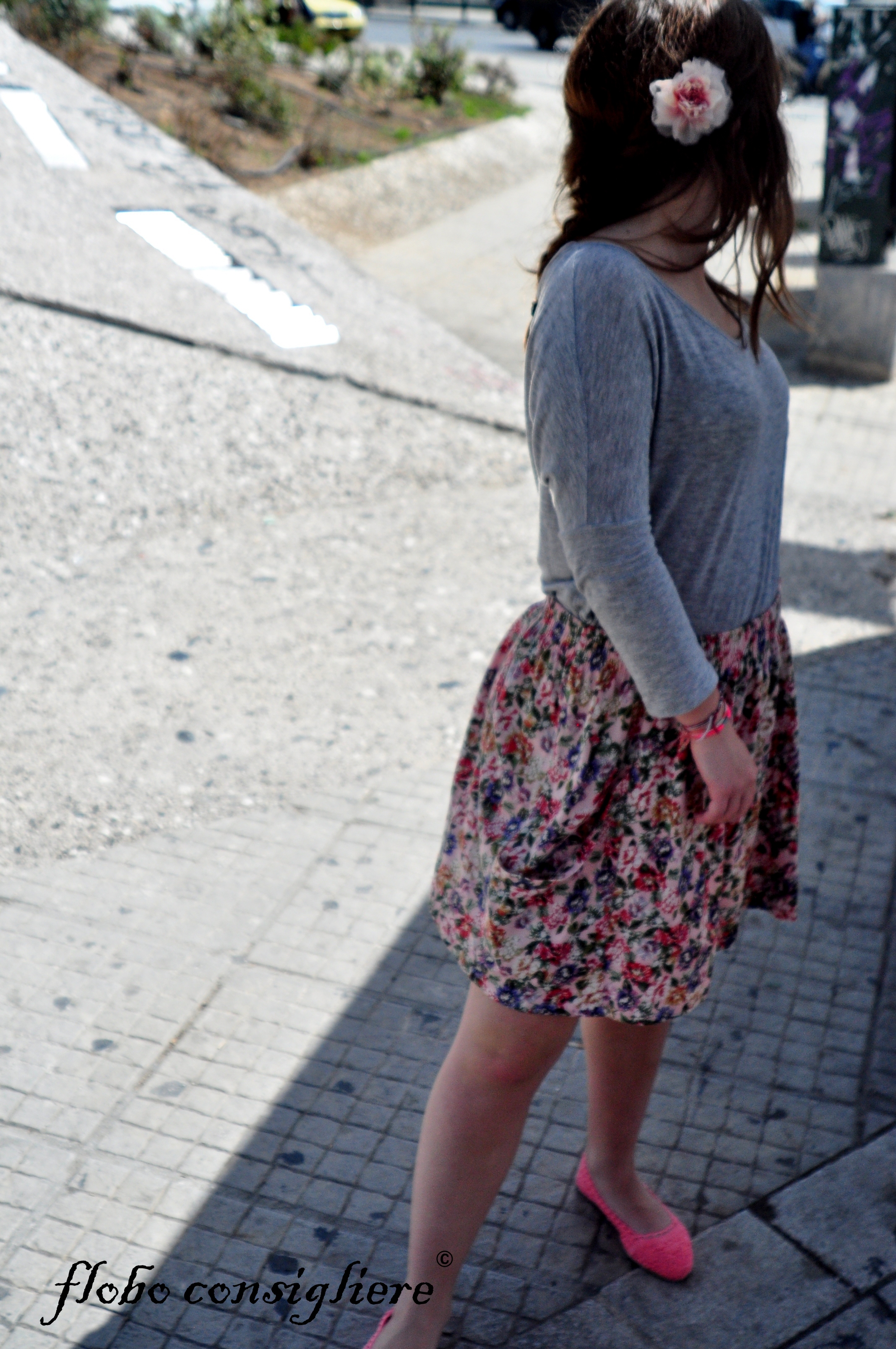 3. I like her face, flower, skirt and shoes breaking through the gray of the environment of concrete – like grass, flowers, and moss on the pavement. she gives the surroundings a touch of nature. 🙂