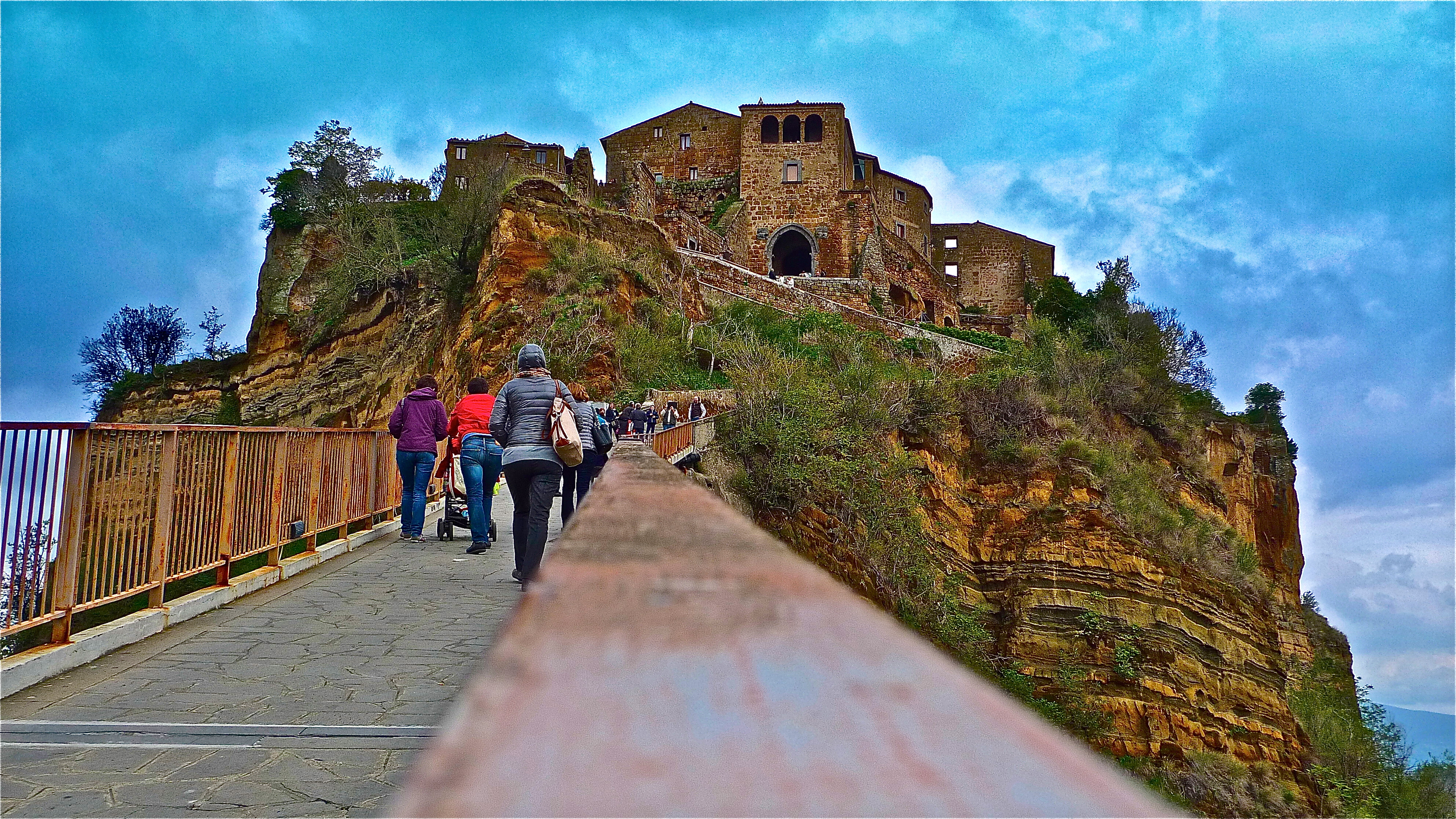 This frame shows a view of the steep vertical climb on the foot bridge from Bagnoregio up to Civita di Bagnoregio — one of Italy’s prettiest hill towns — located in the Lazio region of Central Italy